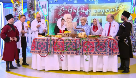 Кавказские женщины накрывают на стол, пока кавказский мужчина развлекает разговором ведущую. Он не обижается за её поведение. Он давно понял, что она УмственноОтсталая. Понял ещё тогда, когда она его руками хватала и хотела его кинжал из ножен вытянуть.