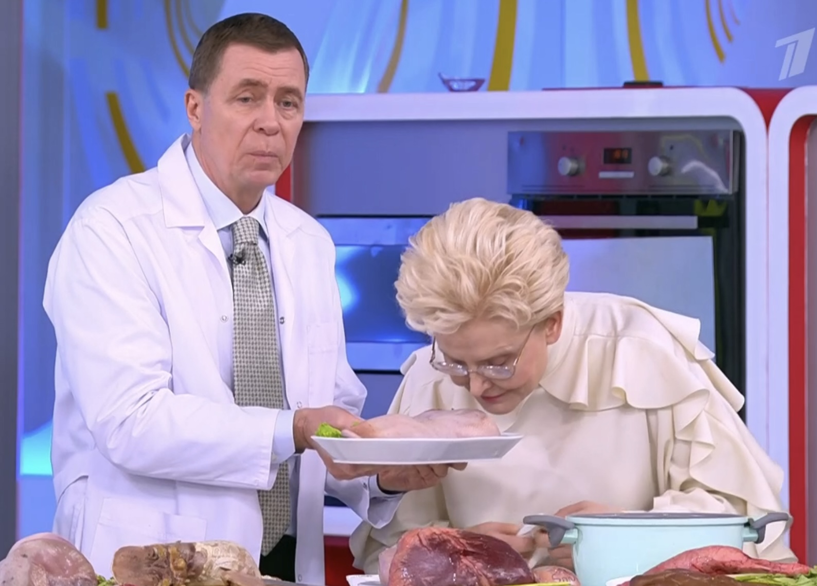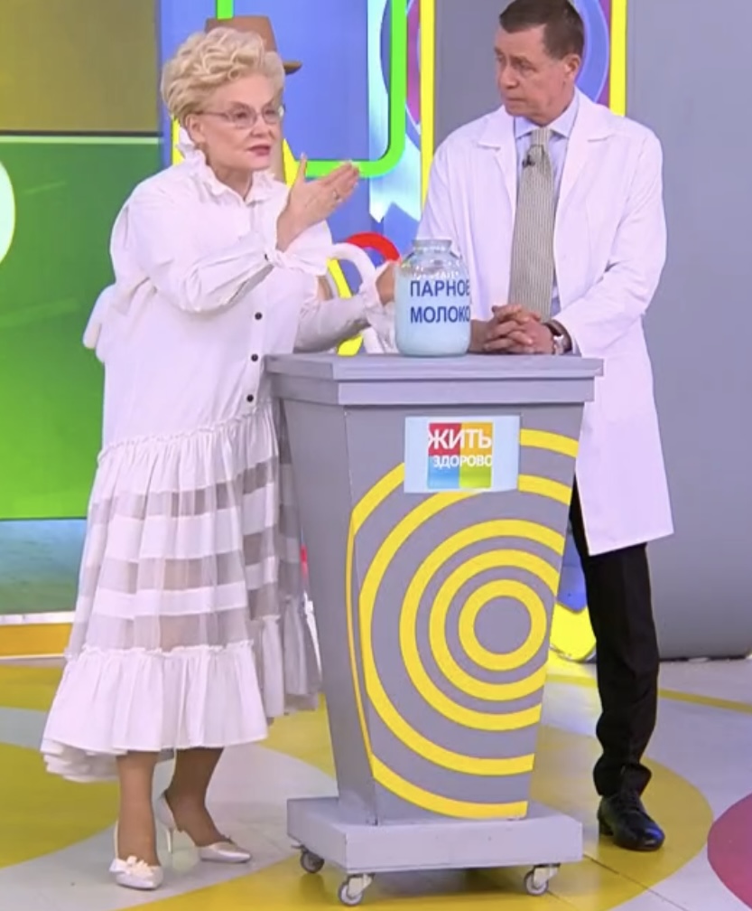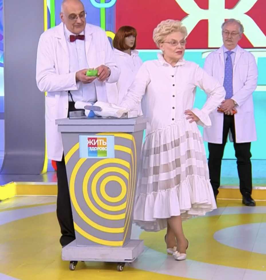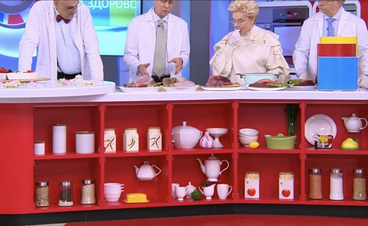 Оба-на. И чО? Малышева снова всех запутала и обманула. 🤣 По-быстрому сдриснул@ с кухни, типа, ей срочно нужно отлучиться к пациенту, сидящему на другой стороне сцены. Про язык все забыли, язык по-тихому уносится в гримёрку...