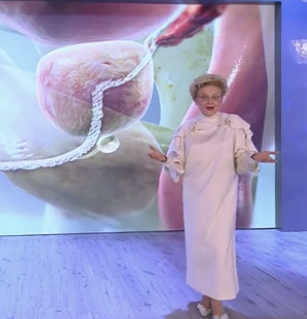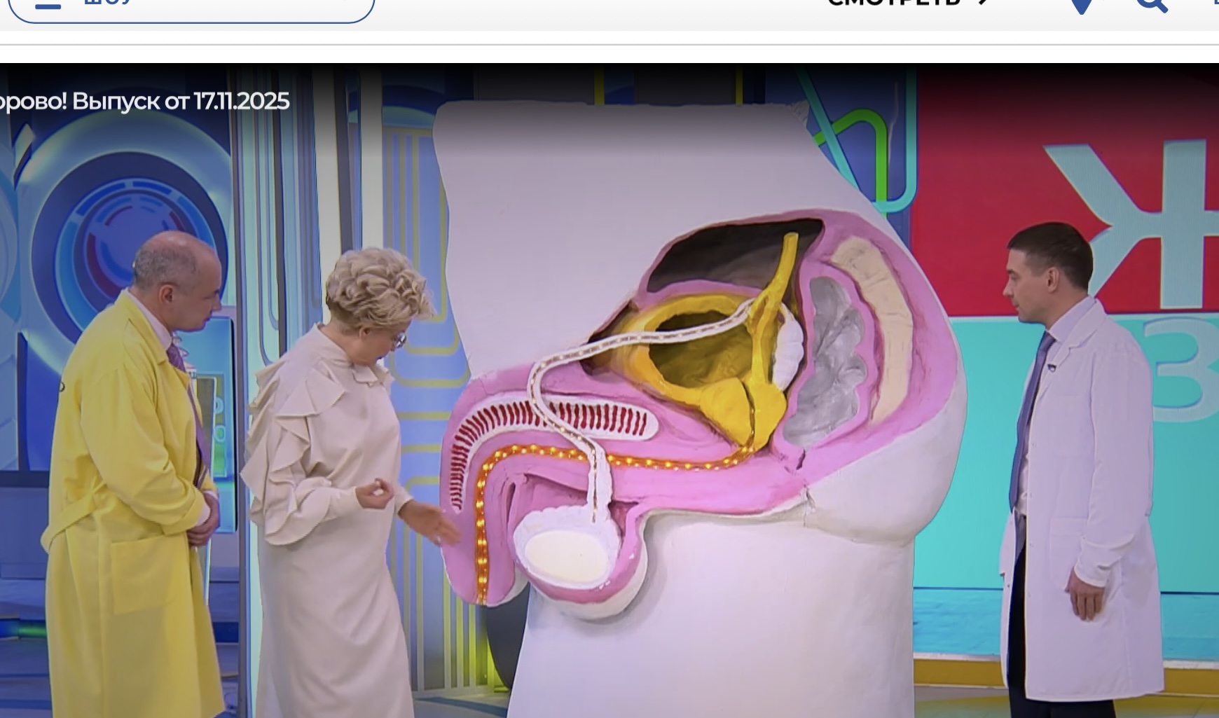 И опять, и снова -- усабрь! Все клоуны в усах, клоунесса -- с простАтой.😉 Весь месяц будем теребить мужские органы в нежных, ласковых руках ведущей. Меняются врачи, пациенты, зрители. И только Ленвасильна никогда не изменяет себе. Она всегда рядом с членом, яичками, ну и... простАтой.
