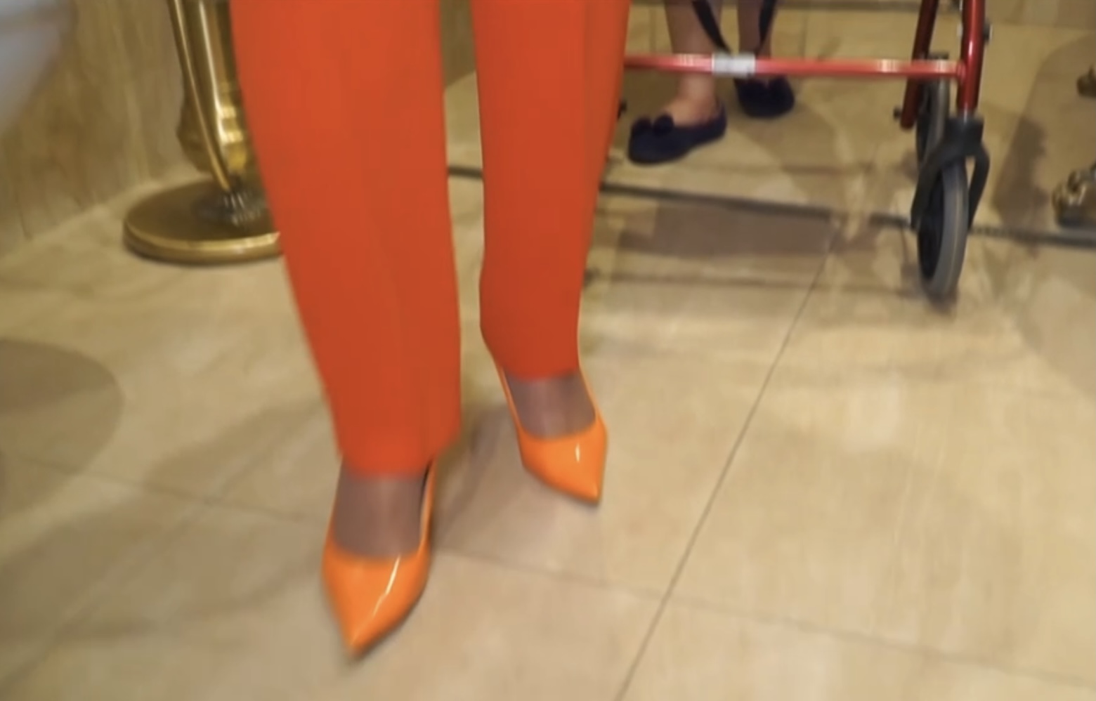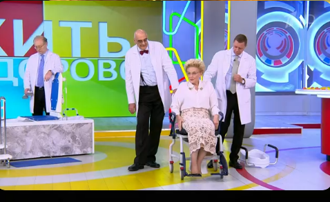 Малышева села в каталку и не хочет вставать. Пока клоуны роются в унитазах и ваннах для пожилых Малышева катается туда-сюда.